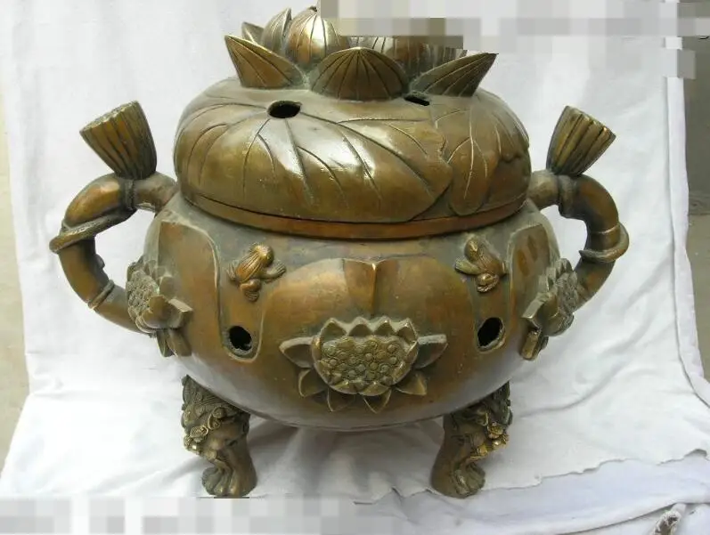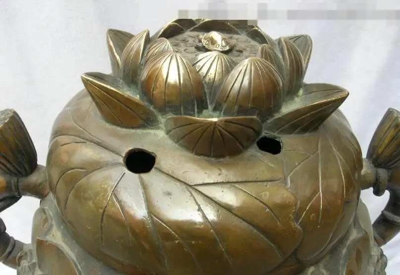 S03001 15"Chinese Bronze Folk Eximous Water lily lotus flower incense burner Statue B0403
